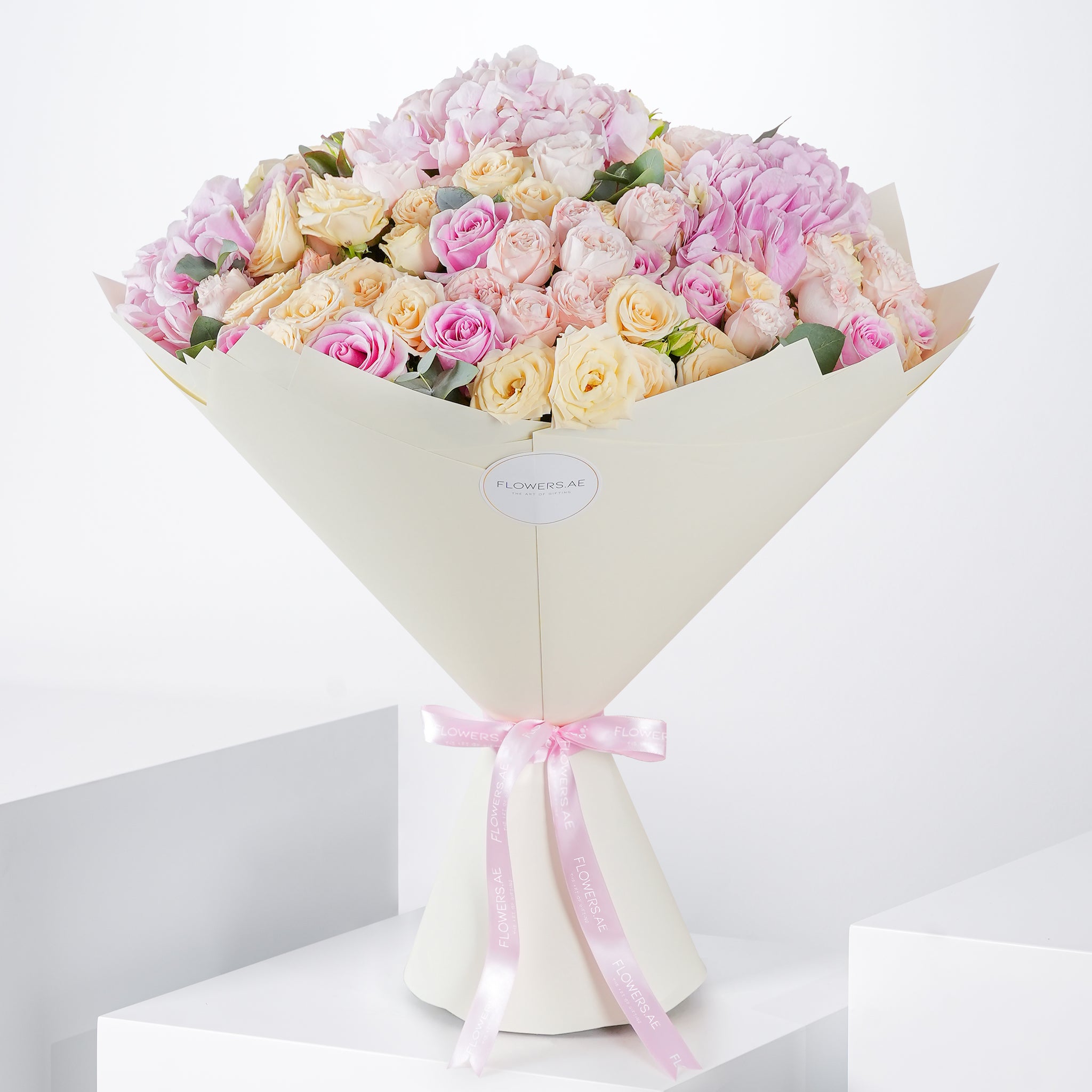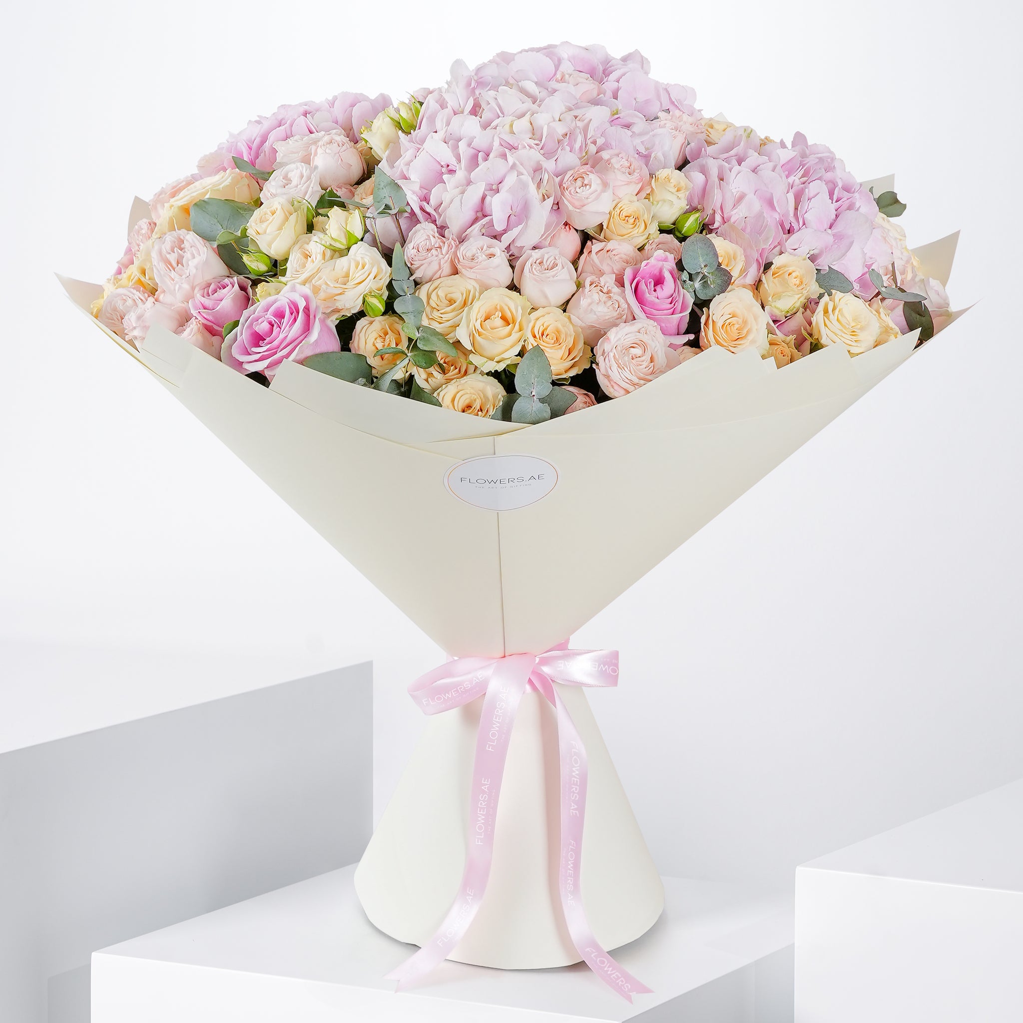 Soft, joyful, and full of heart—this pink-toned arrangement combines pink hydrangeas, pink roses, and spray roses, accented with eucalyptus leaves. A lovely way to celebrate meaningful accomplishments with a fresh and feminine touch.
