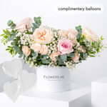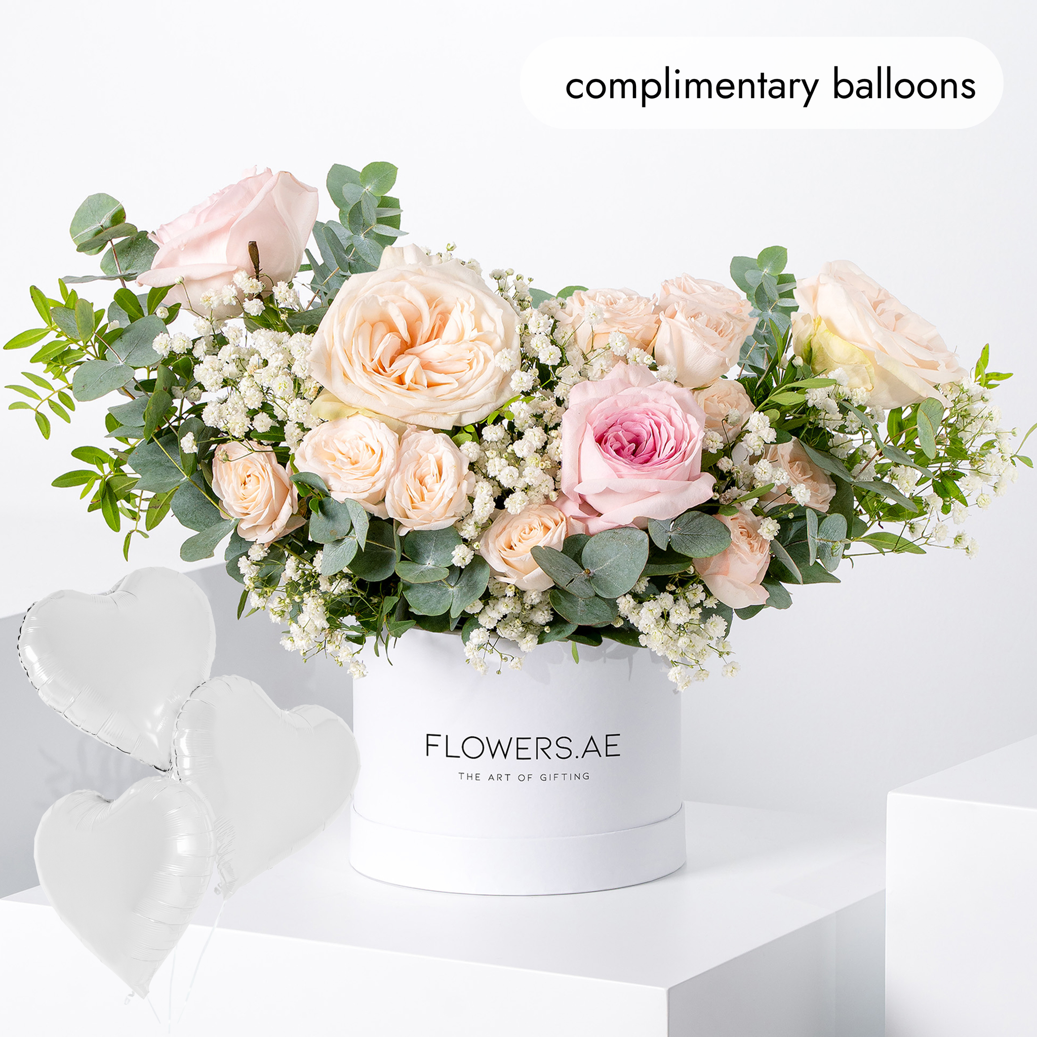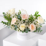 A stunning white flower arrangement featuring Ohara roses, Vendela roses, and white wax flowers with lush greenery. Radiating elegance and serenity, it's a timeless gift symbolizing purity, love, and new beginnings.