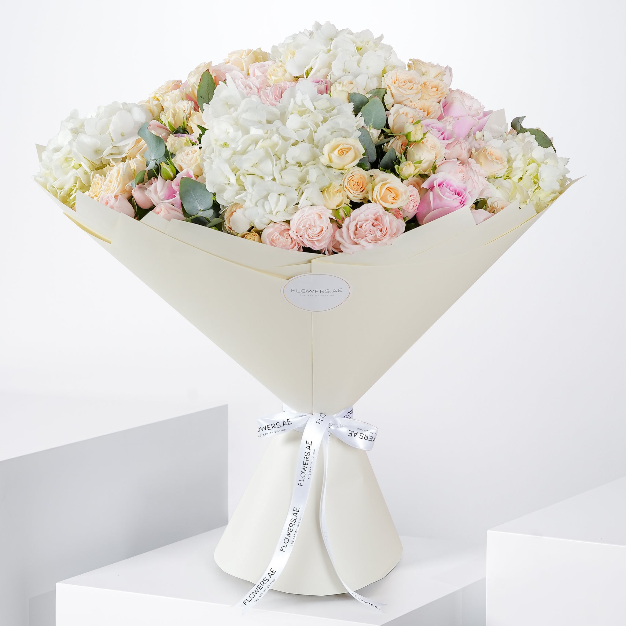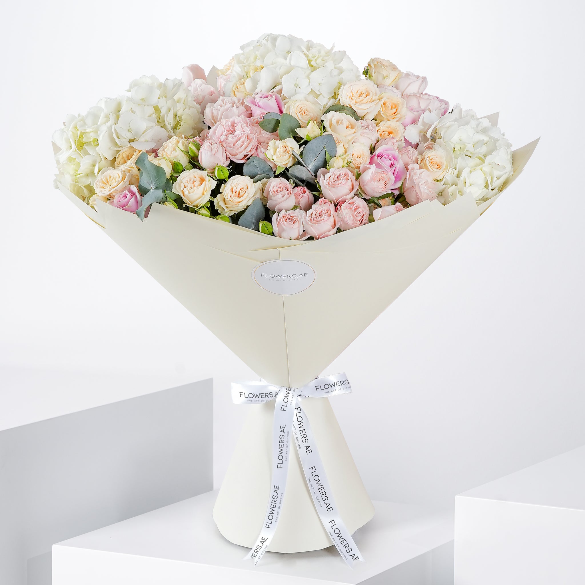 Fresh and timeless, this elegant arrangement brings together white hydrangeas with soft pink roses and spray roses, finished with touches of eucalyptus. A refined choice to celebrate achievements with beauty, warmth, and grace.