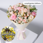 A beautiful way to say congratulations, this charming hand-tied bouquet features Spray Rose Bombastic with O’Hara Pink and White roses, delicately complemented by gypsophila. Finished with pistache and eucalyptus, it’s a graceful floral gift to celebrate proud moments and new beginnings in style.