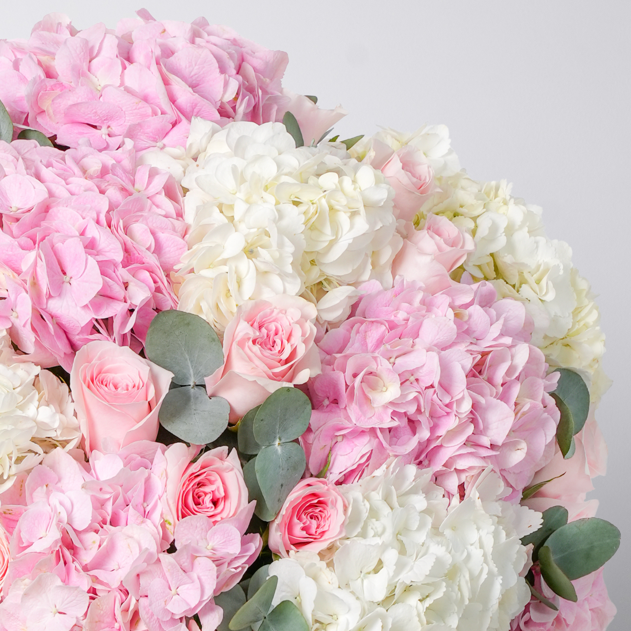 A combination of gorgeous pink roses, white hydrangeas, pink hydrangeas and pink wax complemented by Eucalyptus greens in a hatbox will make the perfect gift to welcome a baby girl.