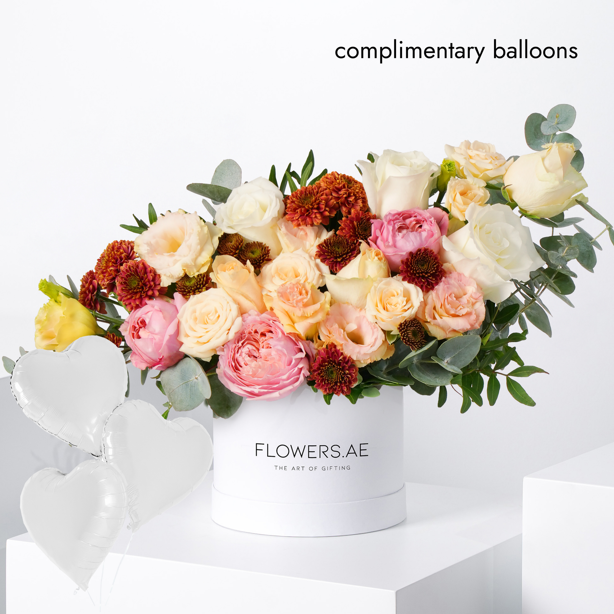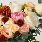 Romantic pastels meet autumn charm in this signature petite hatbox arrangement, brimming with roses and lisianthus accented with fresh eucalyptus leaves for an effortlessly elegant gift.